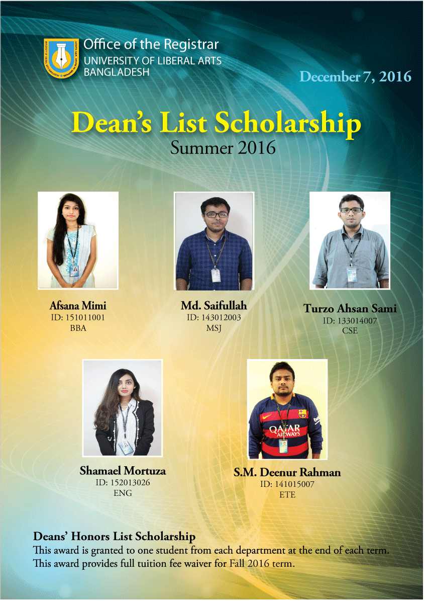 Home News Vice Chancellor’s and Dean’s Honors List Scholarships, Summer 2016 Vice Chancellor’s and Dean’s Honors List Scholarships, Summer 2016 Publish Date: Wednesday, December 7, 2016 Vice Chancellor's and Dean's Honors List Scholarships, Summer 2016