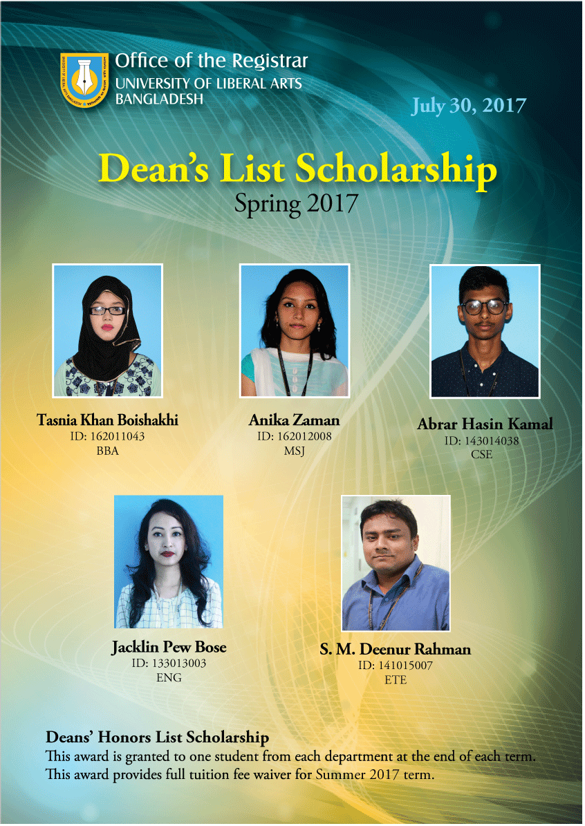 Home News Vice Chancellor’s and Dean’s Honors List Scholarships, Spring 2017 Vice Chancellor’s and Dean’s Honors List Scholarships, Spring 2017 Publish Date: Wednesday, August 2, 2017 Vice Chancellor's and Dean's Honors List Scholarships, Spring 2017