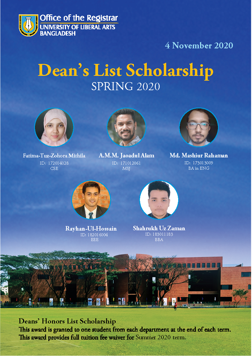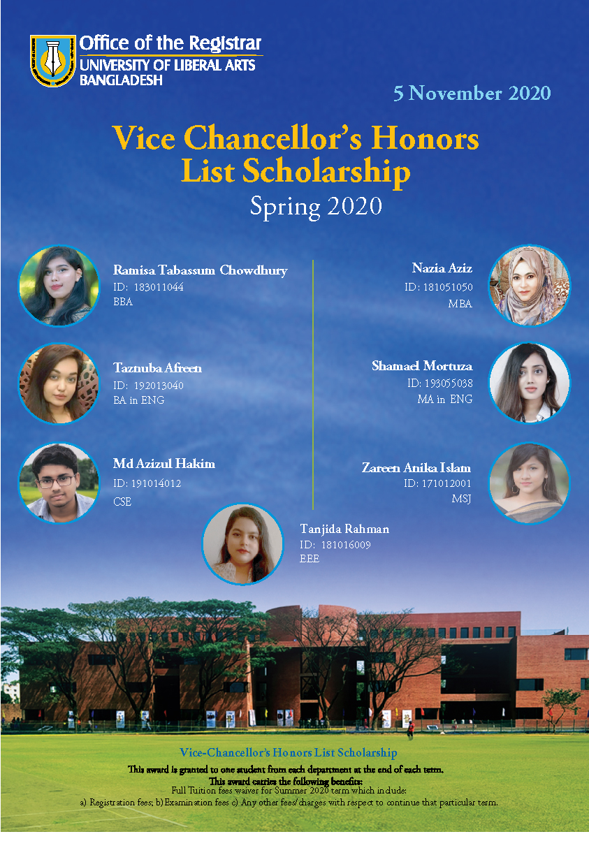 Home News Vice Chancellor’s and Dean’s Honors List Scholarships, Spring 2020 Vice Chancellor’s and Dean’s Honors List Scholarships, Spring 2020 Publish Date: Thursday, November 5, 2020 The Office of the Registrar is pleased to announce the winners of the Vice Chancellor’s and Dean’s Honors List Scholarships, Spring 2020.
