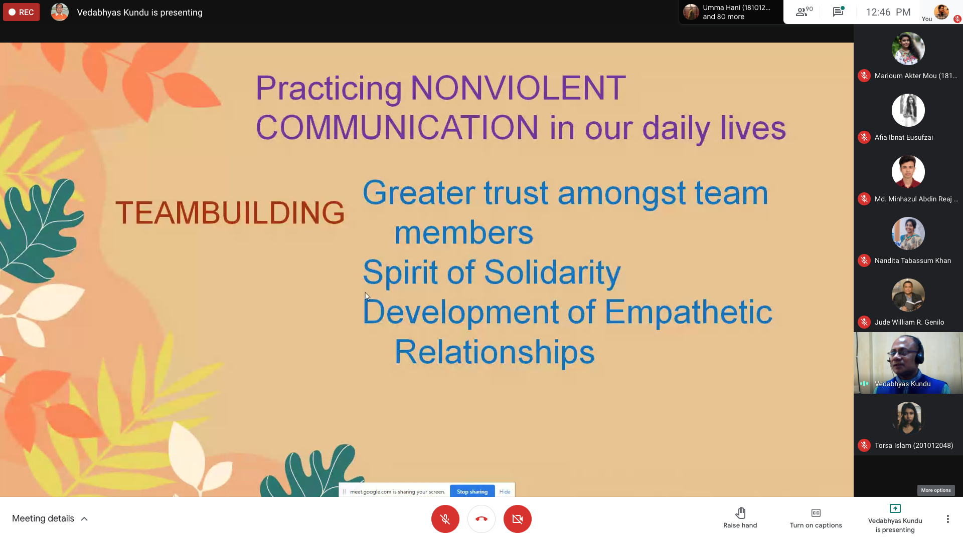The session was then conducted by Dr. Vedabhyas Kundu, the Programme Officer of Gandhi Smriti, and Darshan Samiti, an institute under the Ministry of Culture, Government of India. Dr. Kundu shed light on the topic through a well-briefed presentation. He discussed 12 aspects of nonviolent communication and the opportunity to practice nonviolent communication in daily life.