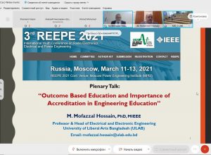 Prof. Dr. M. Mofazzal Hossain delivered a plenary talk in IEEE International Youth Conference on Radio Electronics, Electrical and Power Engineering (3rd REEPE 2021), Moscow, Russia on 11 March 2021. The title of his talk was: “Outcome Based Education and Importance of Accreditation in Engineering Education