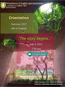 ULAB’s Department of English and Humanities welcomed its incoming undergraduate and graduate students of Summer 2021 through two separate online orientations organized on Google Meet. The undergraduate orientation was held on July 1, 2021 from 3 PM to 4:30 PM and the graduate orientation was held on July 3, 2021 from 7:00 PM to 8:30 PM.