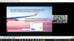 In her talk, Radia Al Rashid first introduced the concepts in aviation linguistics and provided a brief history of the field to the audience comprised of students and faculty members. Then she discussed the linguistic problems related to air traffic control that are often faced by aviators. She clarified the need to understand such problems as they can be crucial to the field of aviation where a slight misunderstanding can have devastating results.