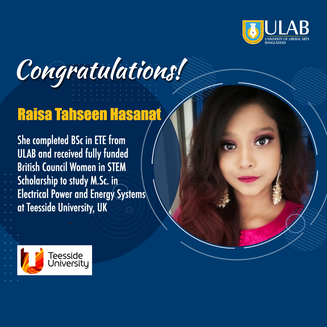 One of our notable alumni, Raisa Tahseen Hasanat, who completed her B.Sc. in ETE from ULAB, has received a fully-funded “British Council Women in STEM Scholarship.” Currently, she is doing M.Sc. in “Electrical Power and Energy Systems” at Teesside University, UK.