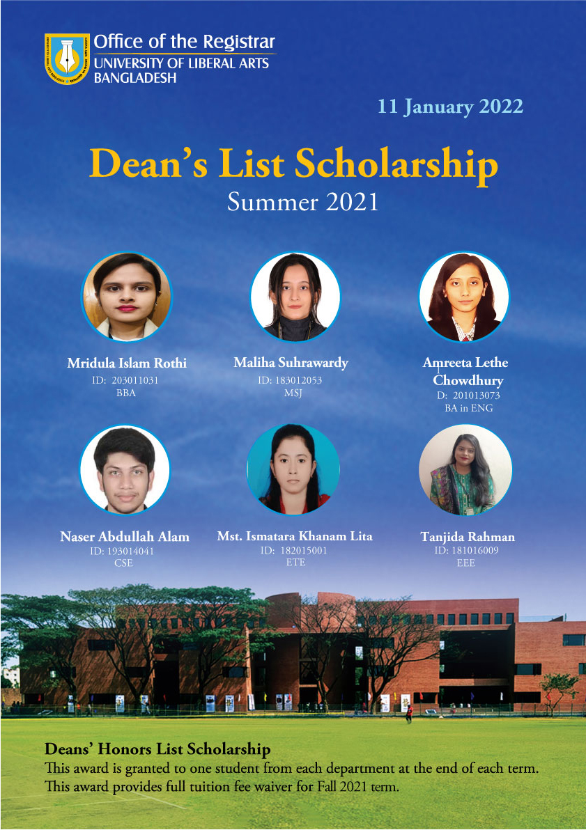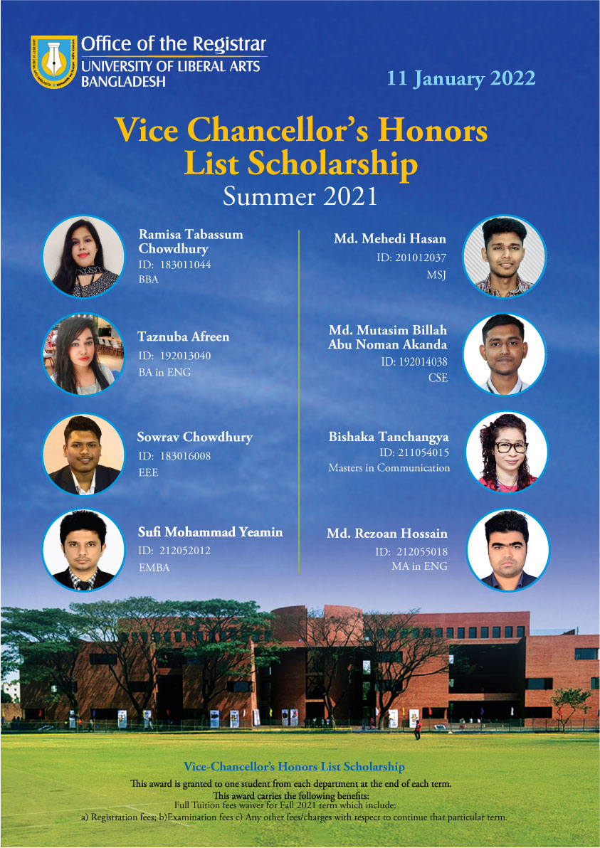 The Office of the Registrar is pleased to announce the winners of the Vice Chancellor's and Dean's Honors List Scholarships, Summer 2021.