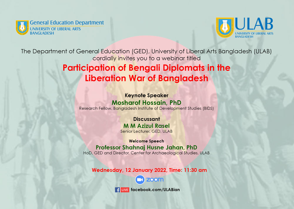The General Education Department (GED) of the University of Liberal Arts Bangladesh (ULAB) organized a webinar titled " Participation of Bengali Diplomats in the Liberation War of Bangladesh” on January 12, 2022, featuring Dr. Mosharof Hossain, Researcher, Bangladesh Institute of Development Studies (BIDS) and M.M. Azizul Rasel, Senior Lecturer, GED. The webinar was graced by the presence of ULAB's Vice Chancellor Professor Imran Rahman.