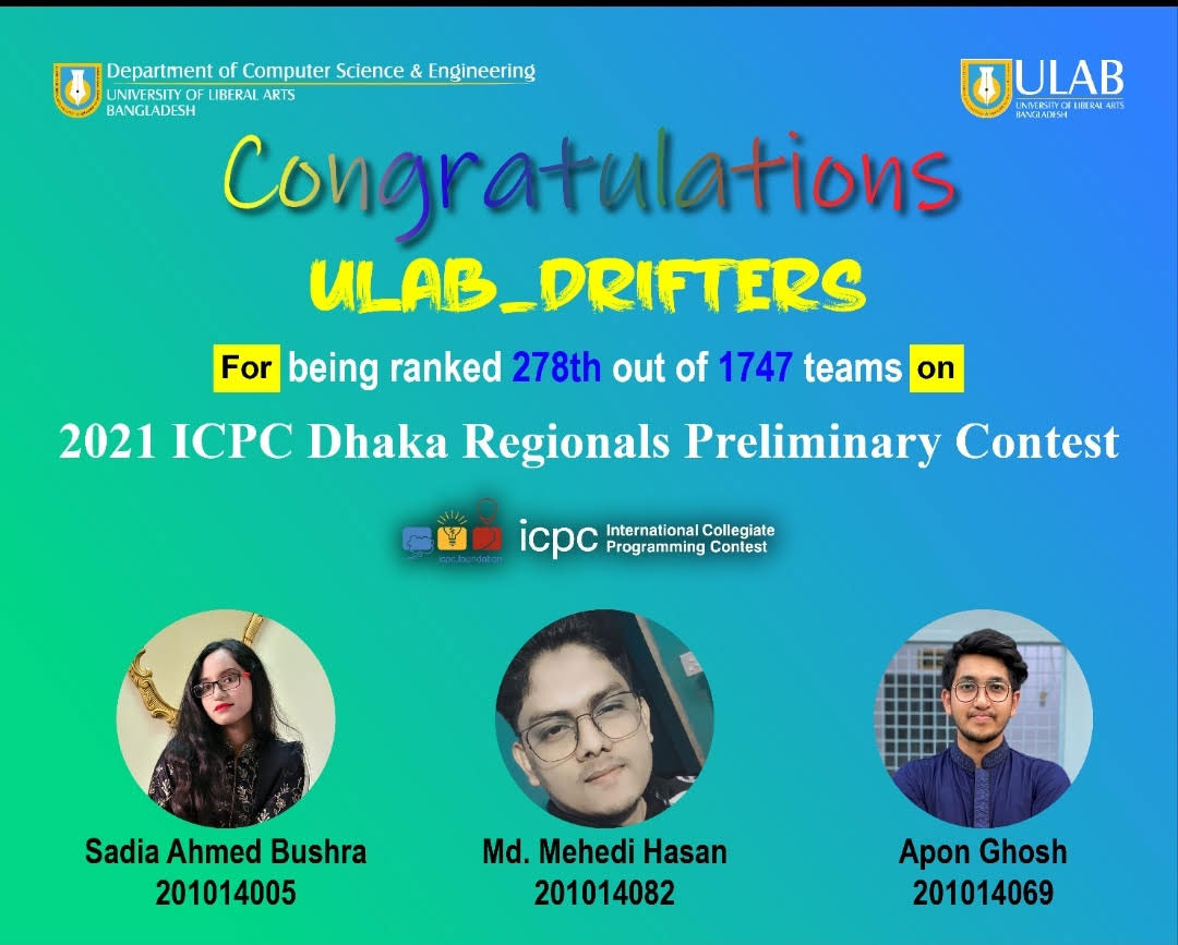 Congratulations to ULAB_Drifters for their fabulous performance in the 2021 International Collegiate Programming Contest - ICPC Asia Dhaka Regional Preliminary Contest held on 3rd September 2022. The team consisted of Sadia Ahmed Bushra, Md. Mehedi Hasan and Apon Ghosh ranked 278th out of 1745 teams from 111 universities in Bangladesh.