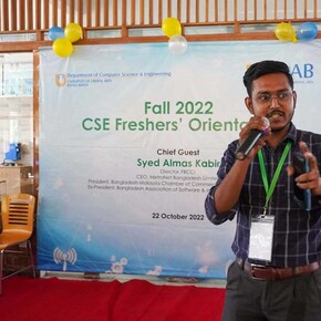 The Department of Computer Science and Engineering (CSE) at the University of Liberal Arts Bangladesh (ULAB) organized the Fall 2022 Freshers' Orientation to welcome the newest members of the family on 22 October 2022 at ULAB Main Campus. Mr. Syed Almas Kabir, Ex-President of the BASIS, Director of the FBCCI, CEO of the MetroNet Bangladesh Limited, and President of the Bangladesh-Malaysia chamber of commerce and industry (BMCCI) was present as the Chief Guest. Professor Imran Rahman, Vice Chancellor of ULAB, Dean of School of Science and Engineering Professor Mofazzal Hossain, Head (Acting) of the Department, faculty members, and freshers were present at the orientation program.