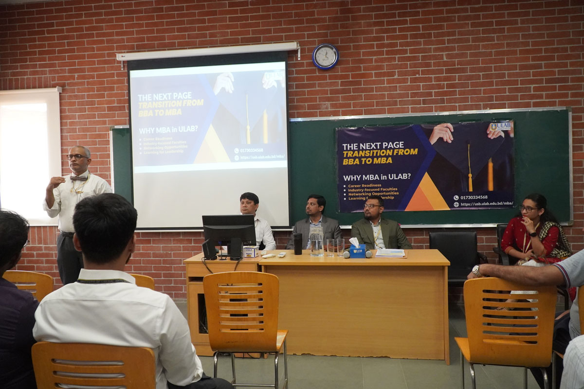 ULAB Graduate Business Programs (MBA & EMBA) organized a special event- “The Next Page: Transition from BBA to MBA” for the outgoing students of Bachelor of Business Program on 11 May 2023 in ULAB Main Campus. The Director of BBA Program Dr. Faisol Chowdhury initiated the event by bidding farewell to his passing students followed by a warm welcome speech by Mr. Asif Uddin Ahmed, Director of Graduate Business Programs. Mr. Asif elucidated on real life facts on how a good postgrad degree can help graduating students in their career while the Coordinator of MBA Program Mr. Tawhid Reaz illustrated competitive advantage of a postgrad degree in current job market. The Director of ULAB EMBA Program Dr. Shamsuddin Ahamad, Head of Admission Mr. Zamal Uddin Bhuiyan and faculty members also attended the occasion. This event was particularly designed for passing students so that they can get an insight on employment scenario and further study opportunity.