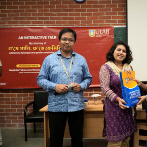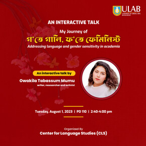 The Center for Language Studies (CLS) organized an interactive Talk titled “গ’তে গালি, ফ’তে ফেমিনিস্ট: Addressing language and gender sensitivity in academia” in PD 110 at the ULAB Main Campus on 1 August 2023. Presided by the Director of CLS Dr. Faheem Hasan Shahed, the session was conducted by author-researcher-activist Owakila Tabassum Mumu.
