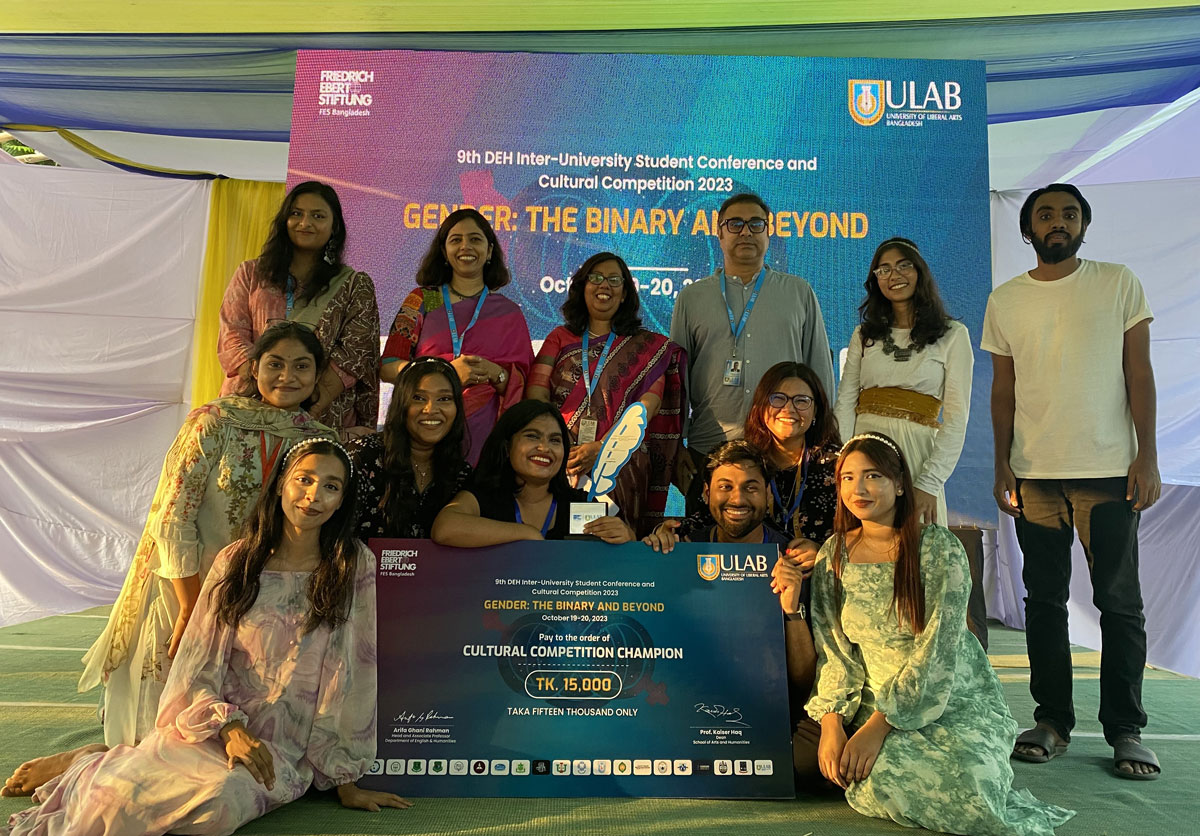 The University of Liberal Arts Bangladesh (ULAB) concluded its 9th Inter-University Student Conference and Cultural Competition, a two-day event organized by the Department of English and Humanities (DEH) in partnership with Friedrich-Ebert-Stiftung, Bangladesh. The conference, held on October 19-20, 2023, delved into the theme "Gender: The Binary and Beyond," and showcased the collective efforts of students from public and private universities across Bangladesh. “Beyond the Mirror,” the cultural production by ULAB won the Championship in the cultural competition while the Stamford University bagged the Runner-Up Award.