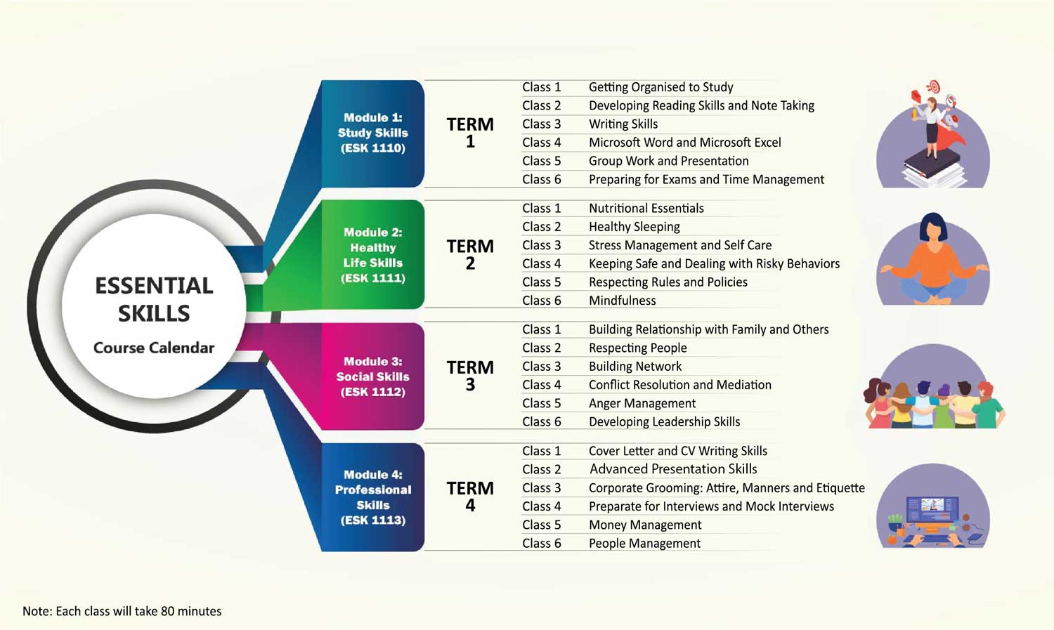 Under the ''Essential Skills (ESK)'' programme, there are four modules - Study Skills (ESK 1110), Healthy Life Skills (ESK 1111), Social Skills (ESK 1112) and Professional Skills (ESK 1113). Each module consists of 6 topics and in total there are 24 topics. These topics cover a broad range of areas starting from Time Management to Mindfulness; from Anger Management to Money Management. In short, these sessions aim to mold the student into a balanced and well-rounded human being, someone who is well prepared to take on the challenges of this modern world.