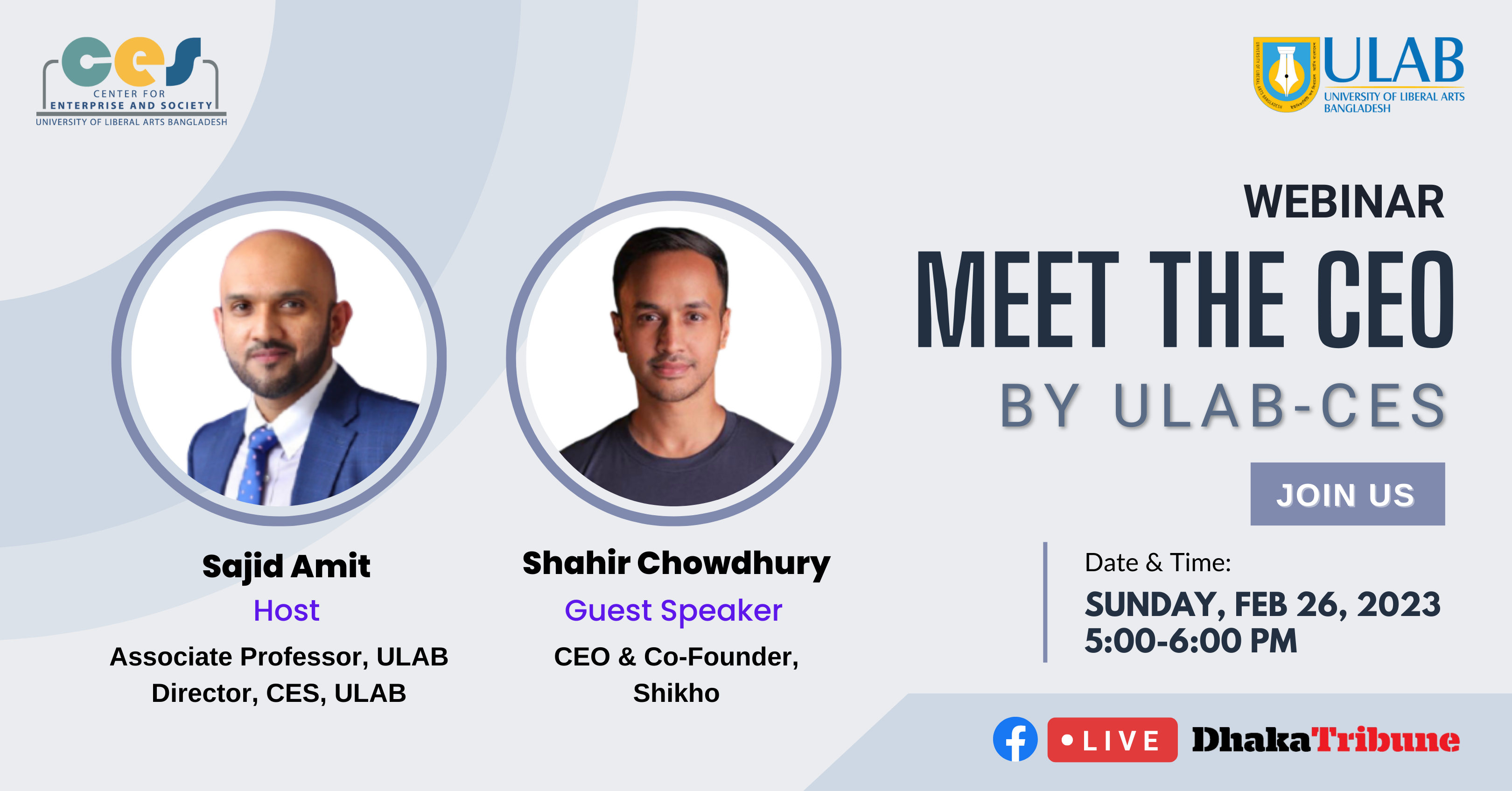 The Center for Enterprise and Society (CES) at ULAB is organizing a webinar titled ‘Meet the CEO by ULAB-CES’ which will be broadcast live on the Dhaka Tribune Facebook Page.