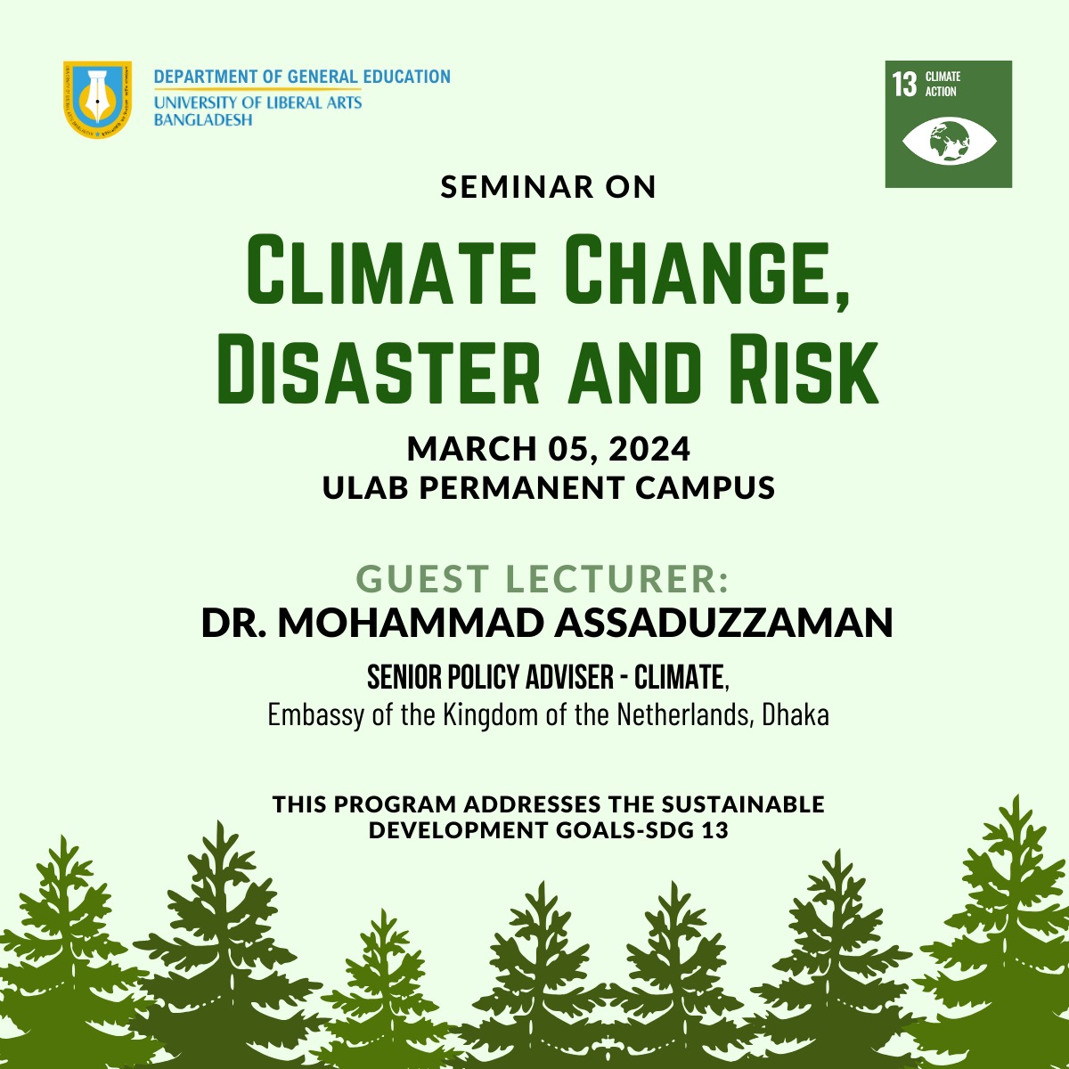Home Events Seminar on 'Climate Change, Disaster and Risk Seminar on 'Climate Change, Disaster and Risk Date March 5, 2024, 10:45 am to 12:15 pm Venue ULAB Campus Organizer General Education Department (GED)