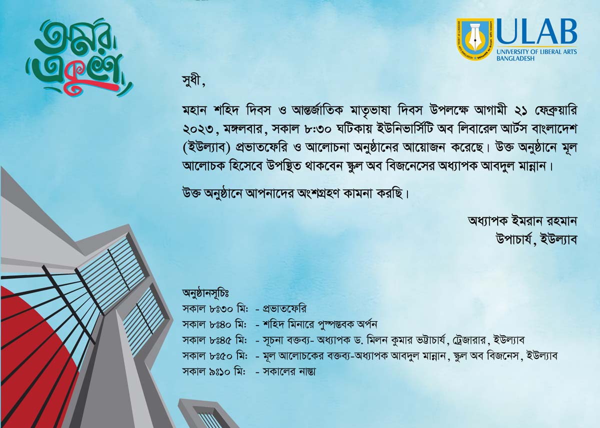 Home Events শহিদ দিবস ২০২৩ শহিদ দিবস ২০২৩ Date February 21, 2023, 8:30 am to 8:30 pm Venue ULAB Campus Organizer ULAB
