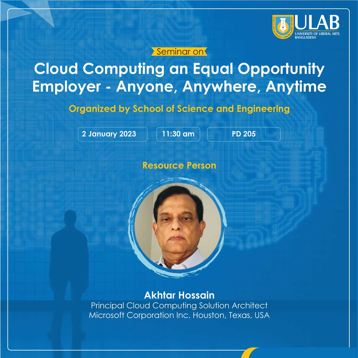 Home Events SSE Seminar on Cloud Computing SSE Seminar on Cloud Computing Date January 2, 2023, 11:30 am to 1:00 pm Venue Room No: PD 205, ULAB Organizer ULAB School of Science and Engineering