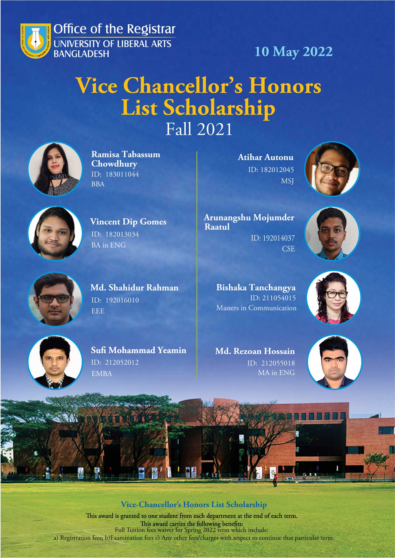 The Office of the Registrar is pleased to announce the winners of the Vice Chancellor's and Dean's Honors List Scholarships, Fall 2021.