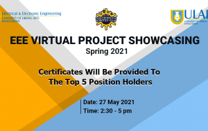 “EEE Virtual Project Showcasing – Spring 2021” was organized jointly by the Department of EEE, ULAB and ULAB Electronics and Robotics Club (UERC), took place on 27 May 2021 at 2.30 pm – 6.30 pm. Students from the EEE, ETE and CSE...