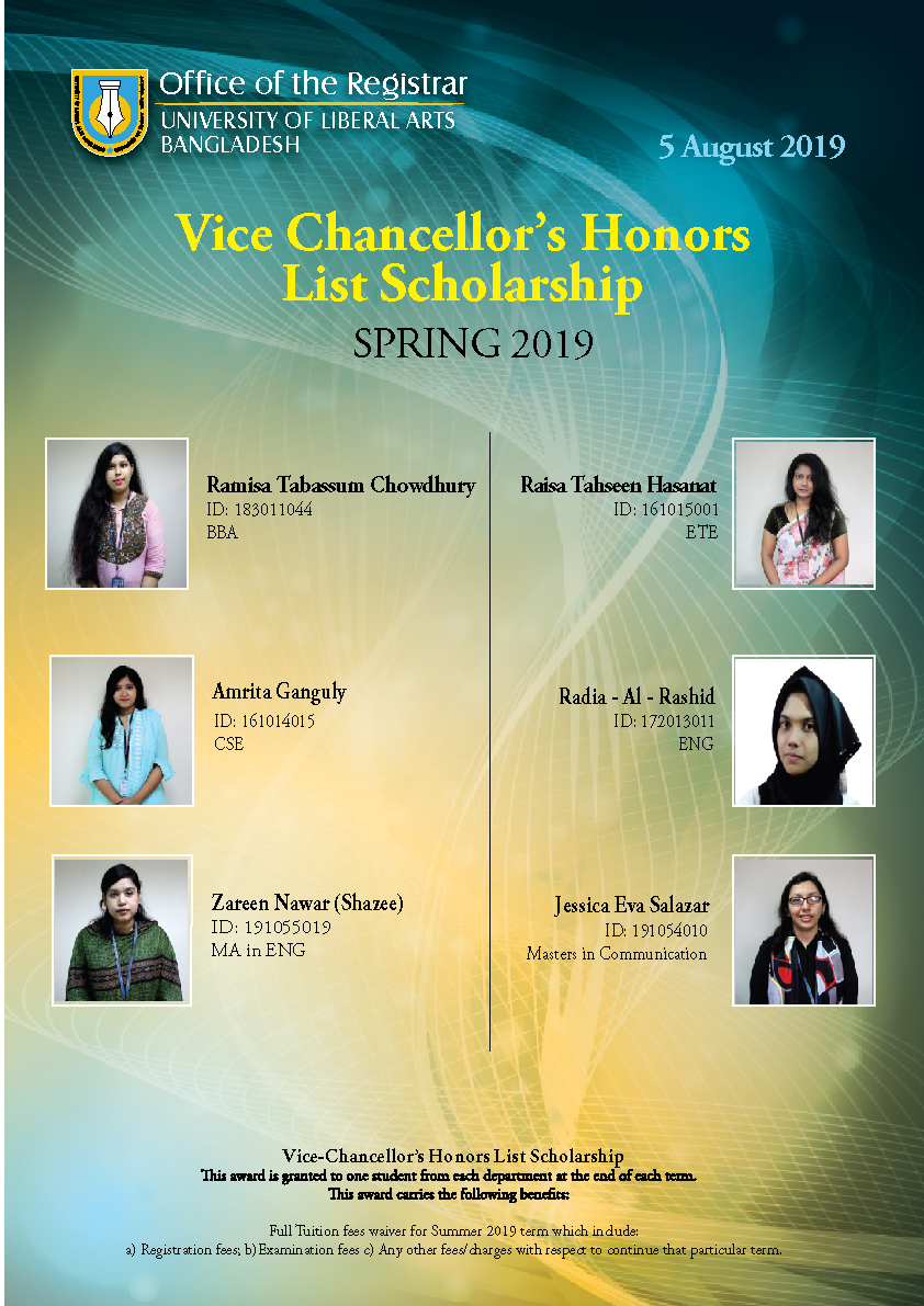 The Office of the Registrar is pleased to announce the winners of the Vice Chancellor's and Dean's Honors List Scholarships, Spring 2019.