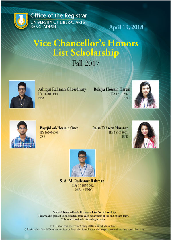 The Office of the Registrar is pleased to announce the winners of the Vice Chancellor's and Dean's Honors List Scholarships, Fall 2017.