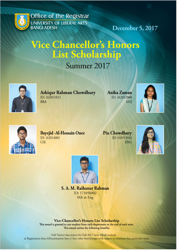 The Office of the Registrar is pleased to announce the winners of the Vice Chancellor's and Dean's Honors List Scholarships, Summer 2017.