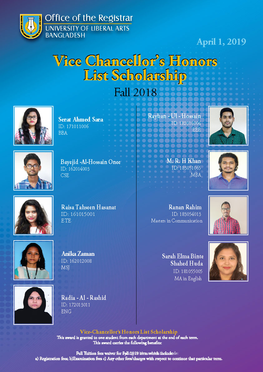 The Office of the Registrar is pleased to announce the winners of the Vice Chancellor's and Dean's Honors List Scholarships, Fall 2018.