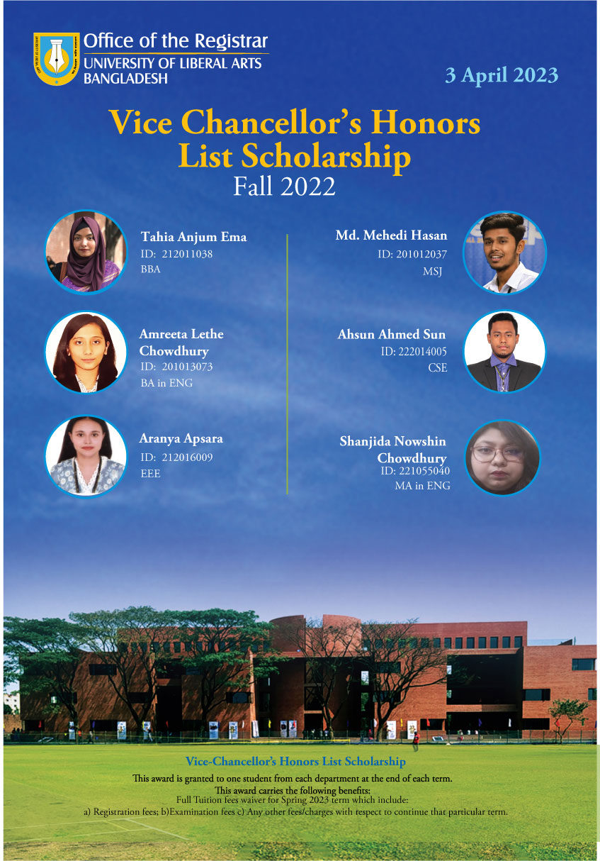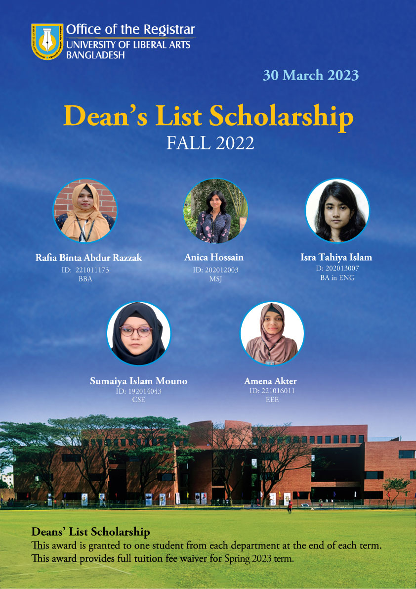 The Office of the Registrar is pleased to announce the nominated student for the Dean's List Scholarship Fall 2022.