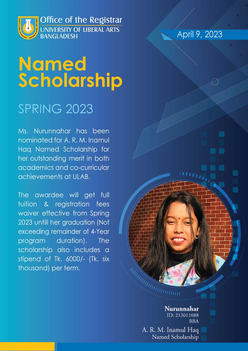 The Office of the Registrar is pleased to announce the nominated student for the Named Scholarship Spring 2023.