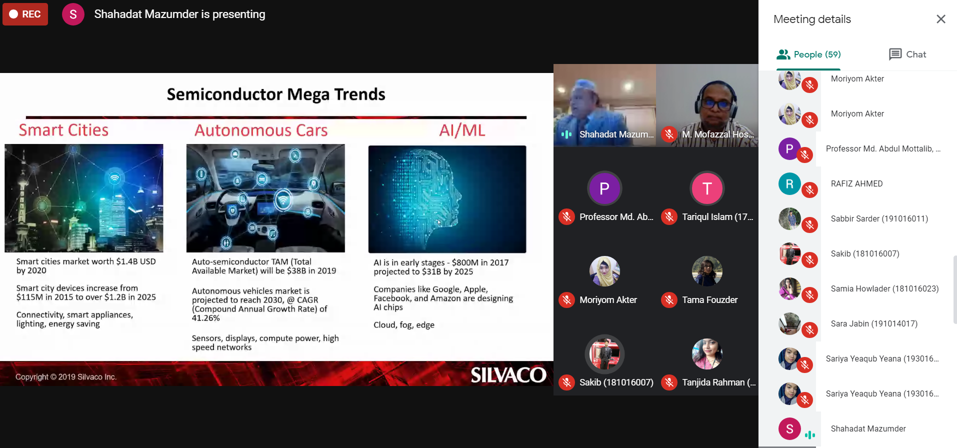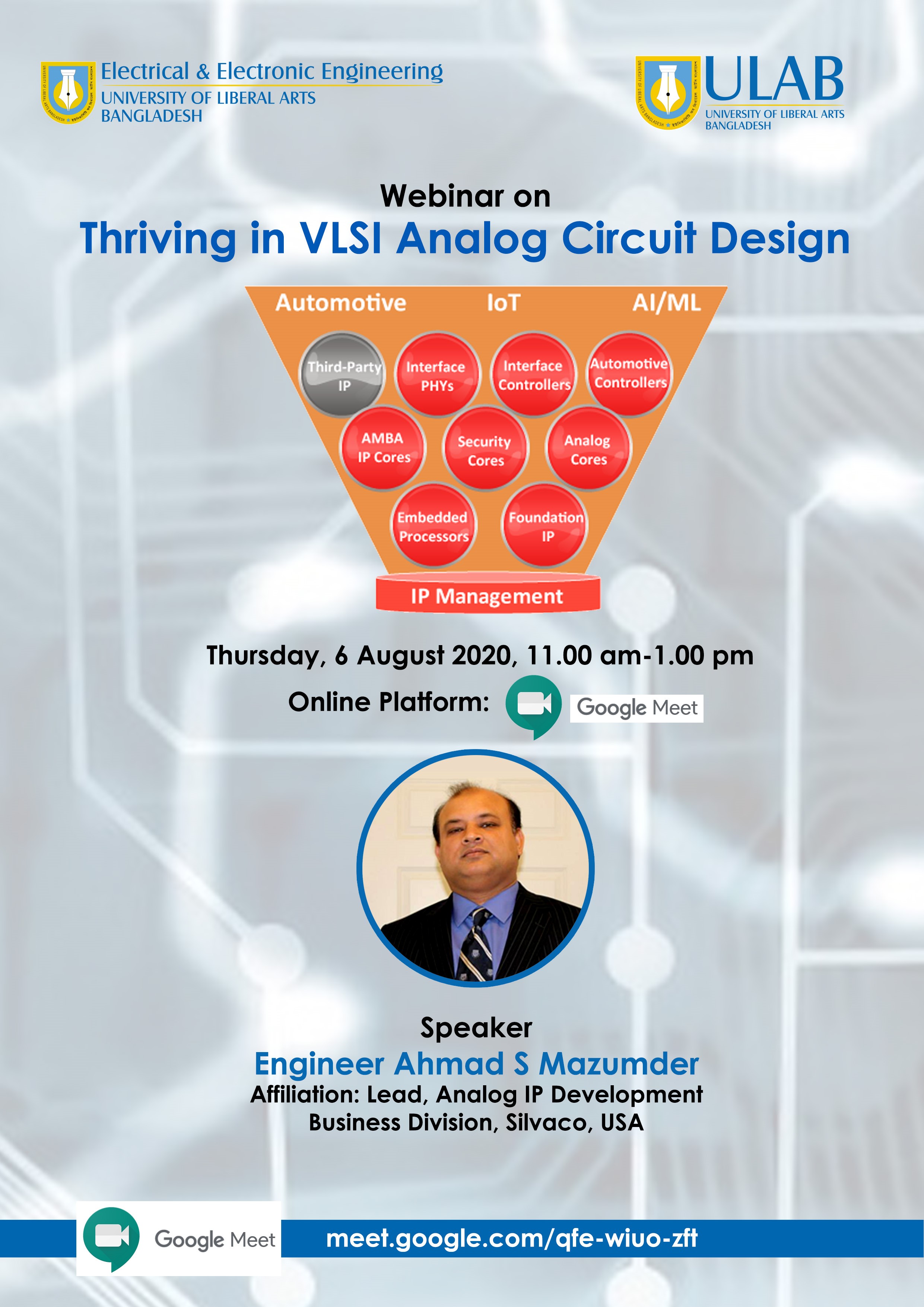 The department of Electrical and Electronic Engineering (EEE) and Electronics and Telecommunication Engineering (ETE) at ULAB jointly organized a webinar on “Thriving in VLSI Analog Circuit Design” via online platform on 6 August 2020. The resource person was Engr. Ahmad S Mazumder is an accomplished Analog Design Engineer in the USA. He has been working in various well-respected high-tech companies for 23+ years. He worked as a Senior Engineering Manager at Intel Corporation for 11 years and as a Senior Principal Engineer at Broadcom Corporation for 2 years. He also held many respectable positions at IBM, Trident Microsystems, C-Cube Microsystems, Microchip technology etc. Currently he is working at Silvaco where he is leading the Analog IP development business division. Honorable Dean of School of Science and Engineering (SSE), Professor Dr. Md. Abdul Mottalib, Prof Dr M. Mofazzal Hossain, Head of EEE Department, distinguished faculty members and students of ULAB were present in this webinar. The speaker discussed the current and future trends in the semiconductor industry, the importance and fundamentals of analog circuits design, the application and importance of analog IC design in developing AI/ML/DL based systems, the significance of life-long learning and innovation in the career of an engineer. After his informative presentation, there was a Q&A session.