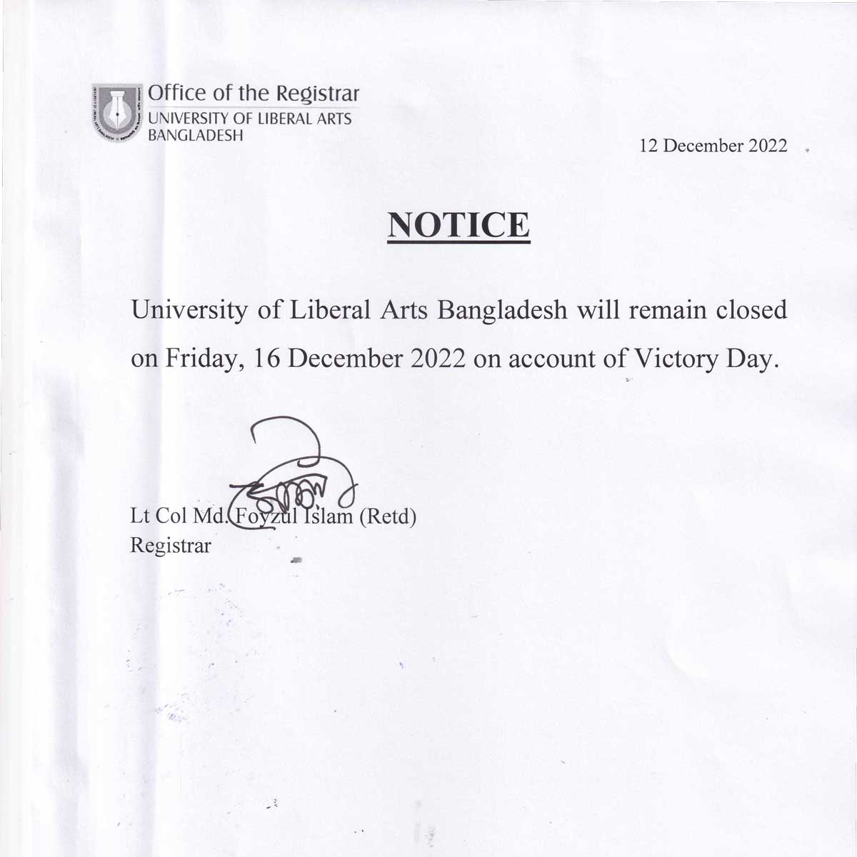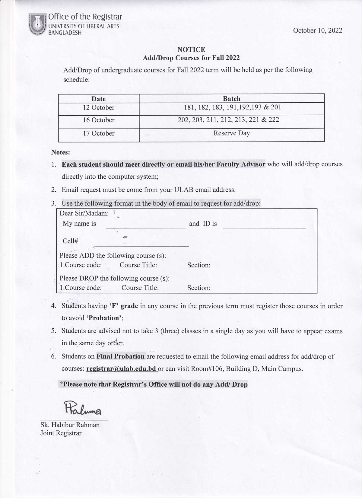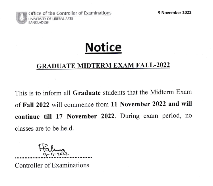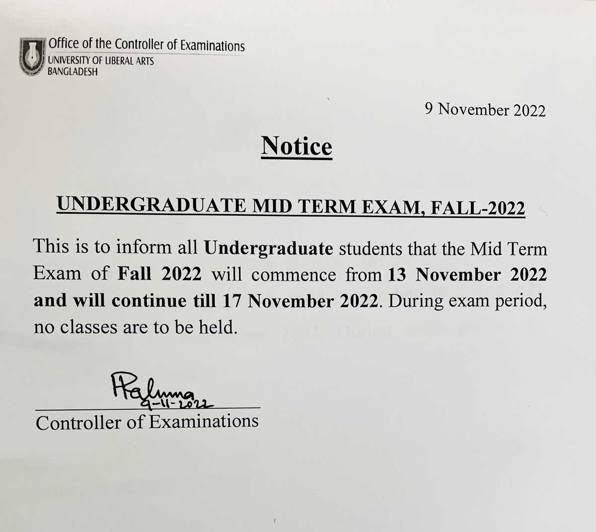 This is to inform you that due to the ongoing cyclone SITRANG, all academic activities including class and exam at ULAB will remain suspended tomorrow, October 25, 2022.