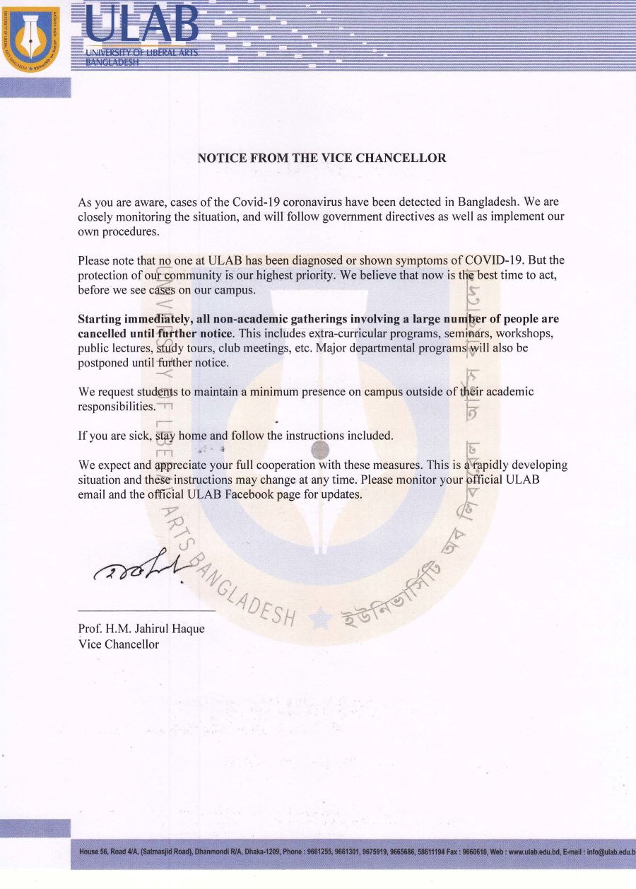As you know, cases of COVID-19 have been detected in Bangladesh. Your safety is our highest priority. Therefore, please take note of the following: