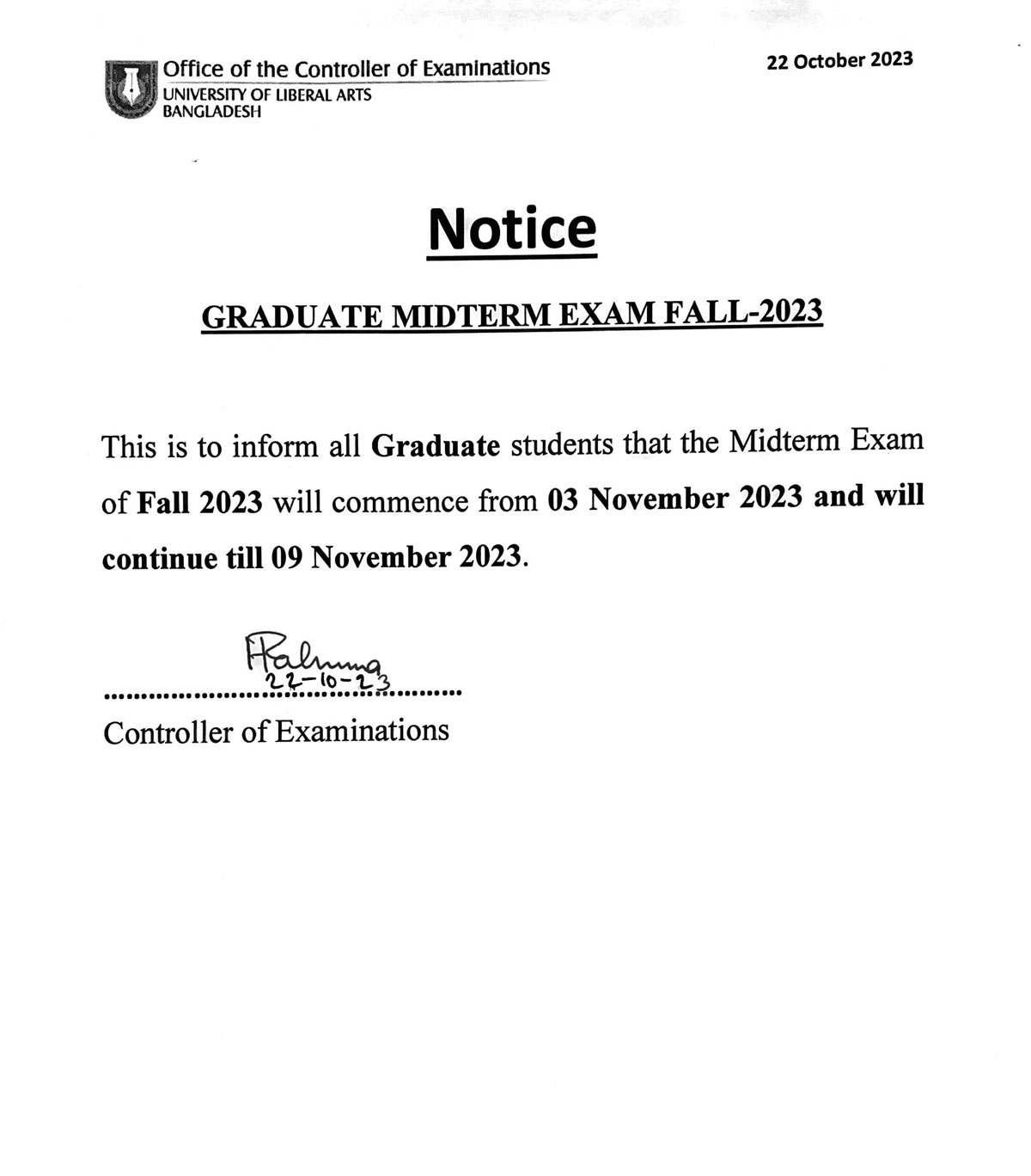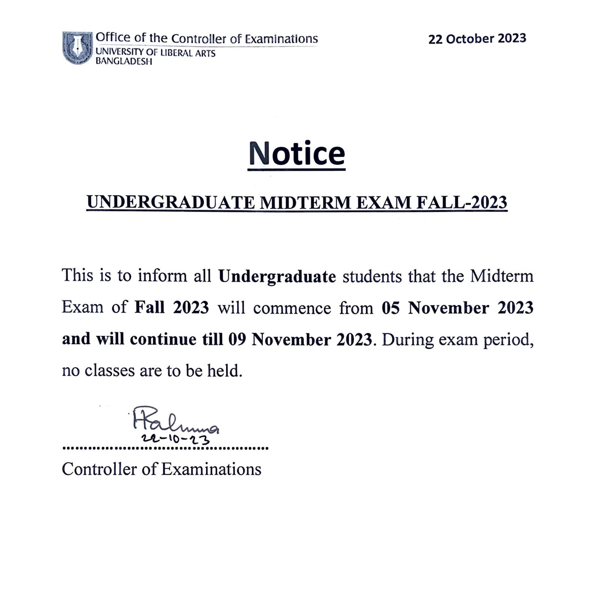 Due to the ongoing uncertainty, Mid-term exams from Sunday 5th November to Thursday 9th November will be held ONLINE as per the Exam Schedule.