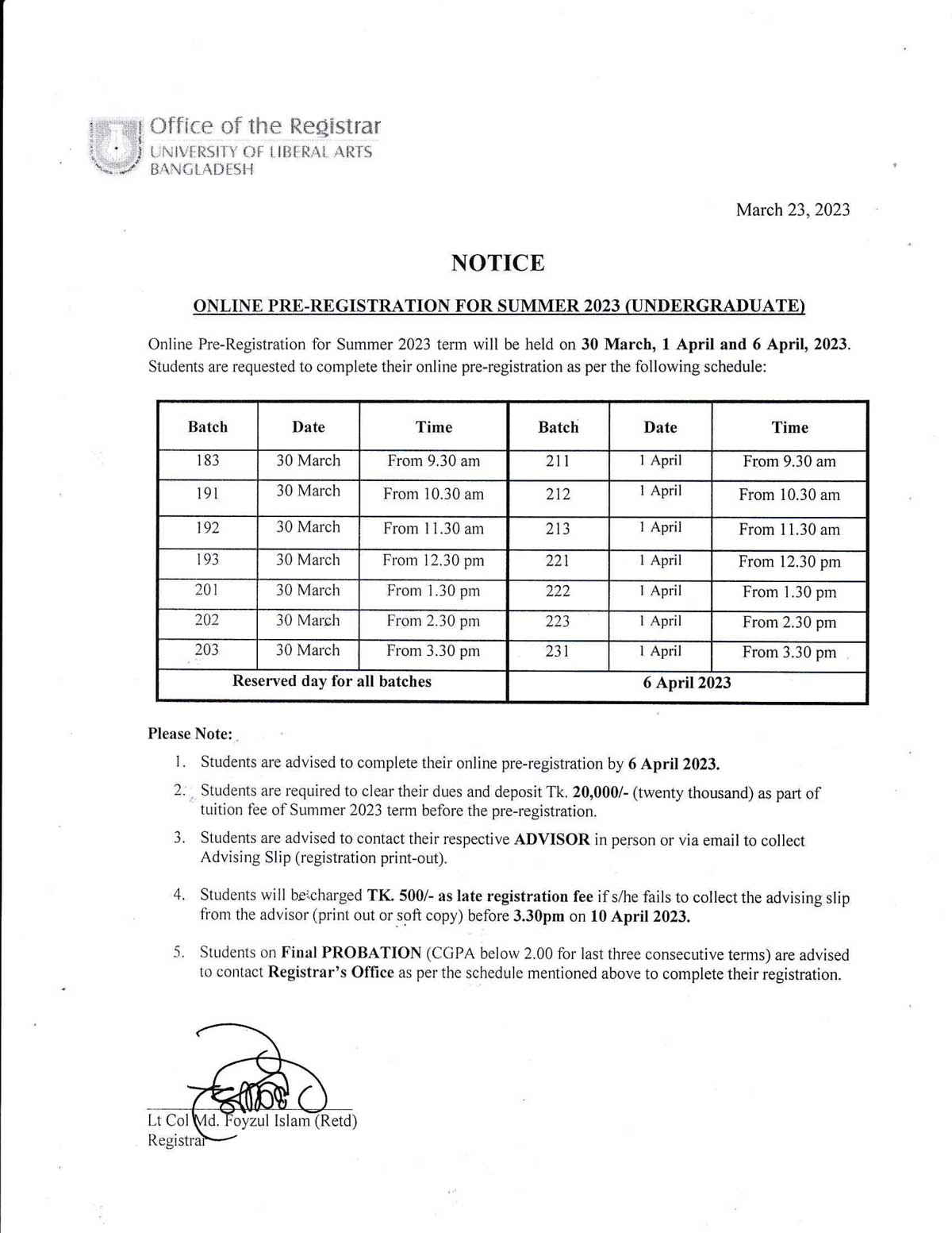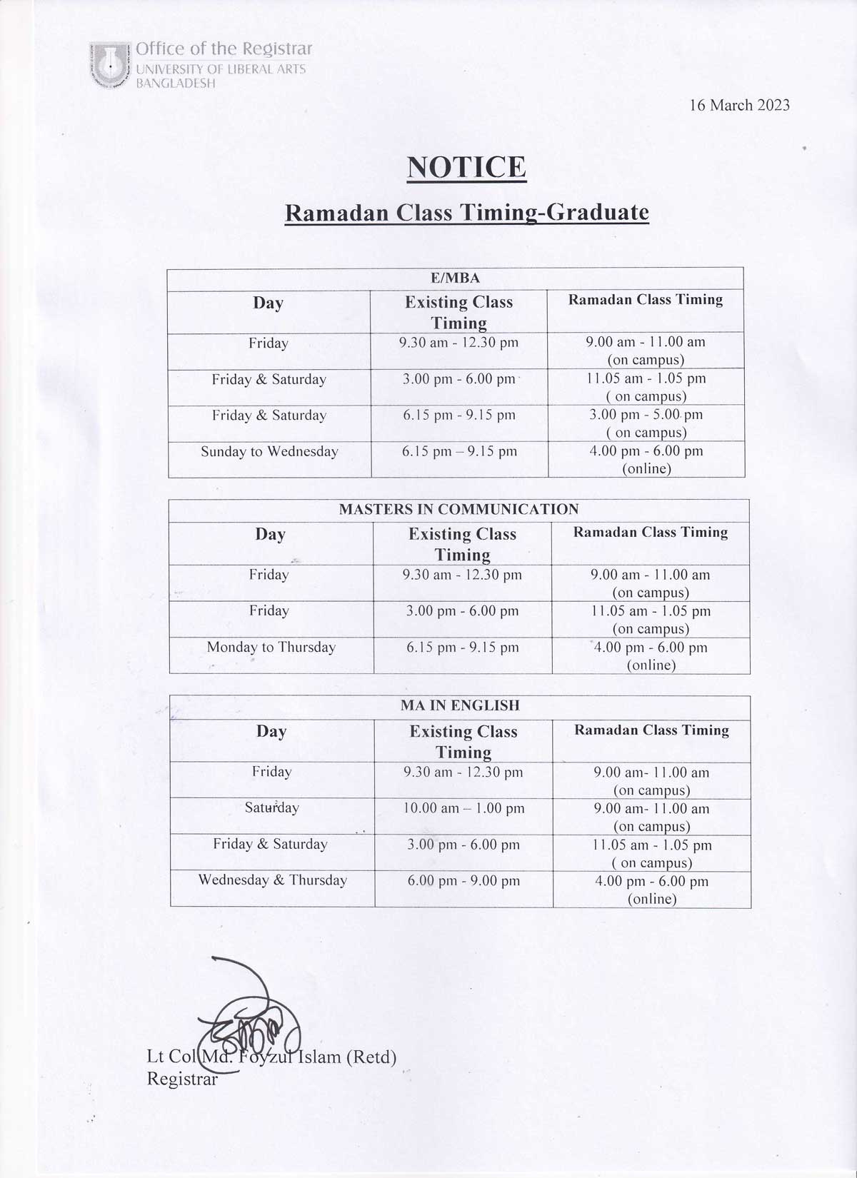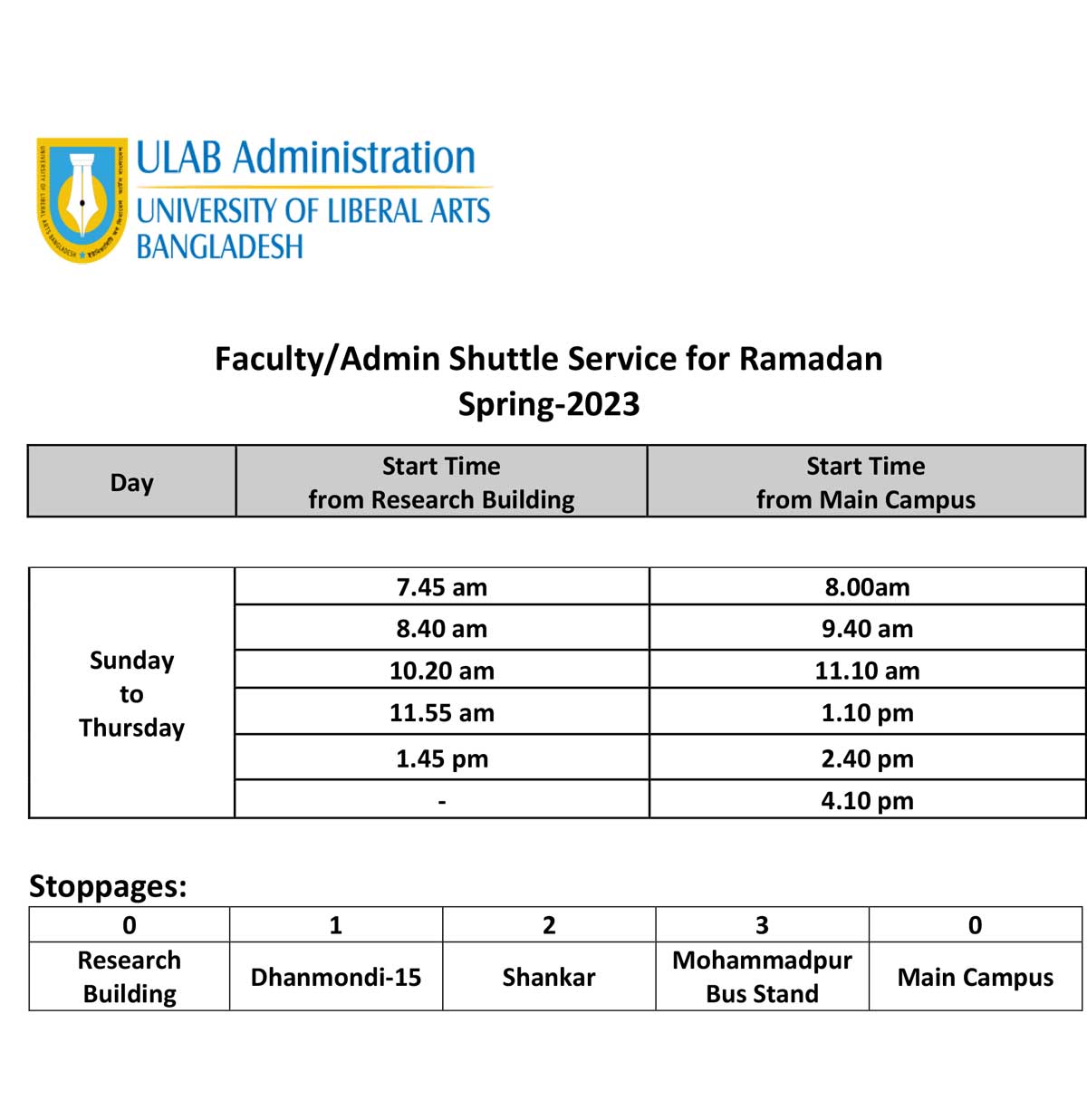 ULAB will remain closed on Sunday, 26 March 2023 on account of Independence Day.